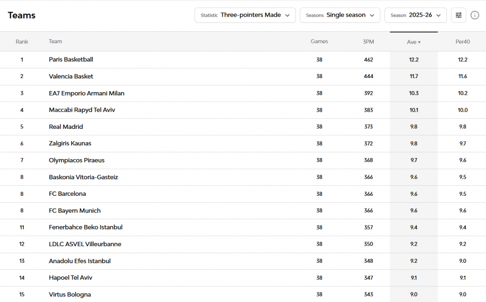 Πιο συγκεκριμένα, η Βαλένθια στην κανονική περίοδο ήταν η ομάδα που είχε τις περισσότερες προσπάθειες για τρίποντο, μετά την Παρί, με τους Ισπανούς να έχουν 31,8 σουτ ανά ματς και τους Γάλλους 32,9.