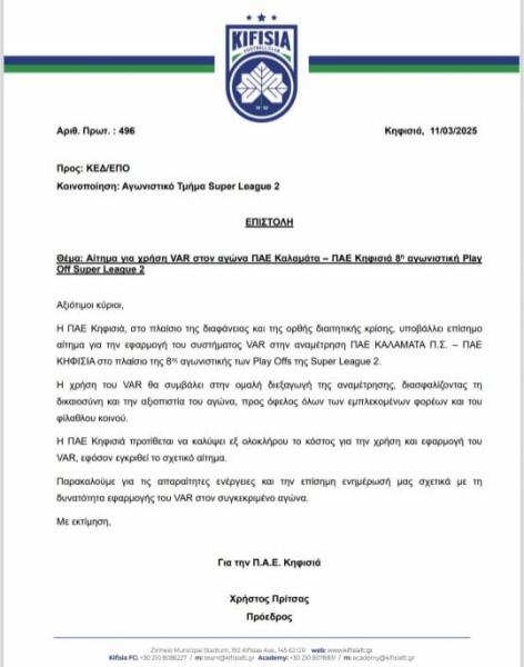 Η ΠΑΕ Κηφισιά, στο πλαίσιο της διαφάνειας και της ορθής διαιτητικής κρισης, υποβάλλει επίσημο αίτημα για την εφαρμογή του συστήματος VAR στην αναμέτρηση ΠΑΕ ΚΑΛΑΜΑΤΑ ΠΣ - ΠΑΕ Κηφισιά, στο πλαίσιο της 8ης αγωνιστικής των play off της Super League 2.